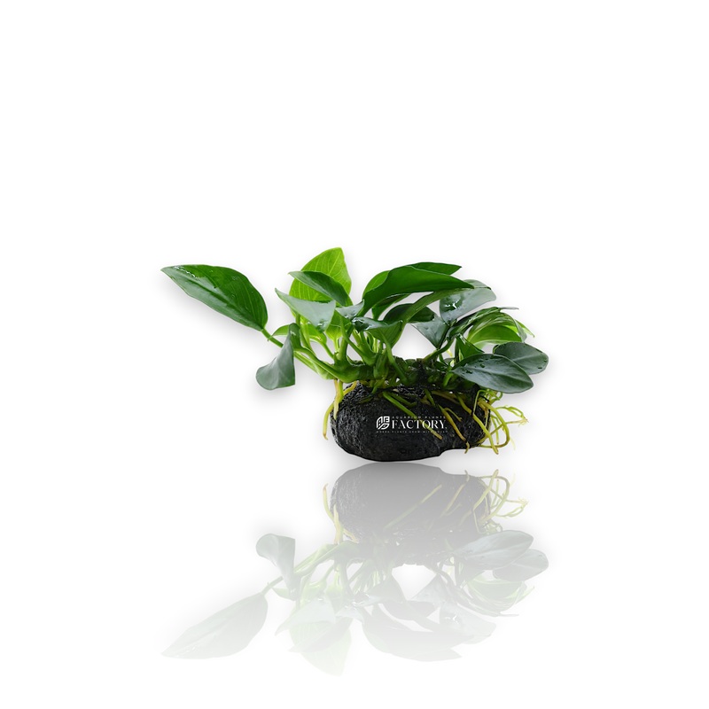 Anubias Petite on Rock is a compact, low-maintenance aquarium plant securely attached to a natural dark lava stone using aquarium-safe black cotton thread. Featuring tiny, deep green leaves and a slow-growing, hardy nature, Anubias barteri var. nana Petite