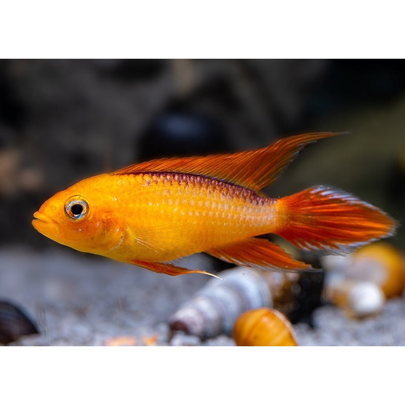 Apistogramma Agassizi, commonly known as Agassiz's dwarf cichlid, isa freshwater fish found in South American. The Gold Fire Red Agassizi isan exceptionally colorful variant of this species. The mature males have a fire red fins. They tends to inbahit slow