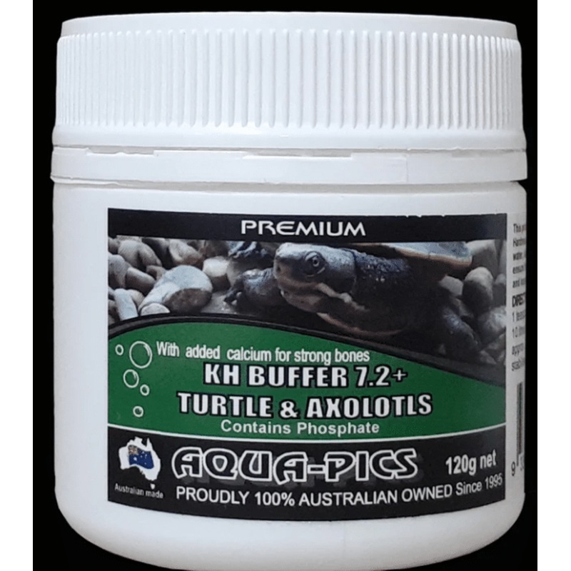 Water with a low pH is acidic and can cause painful acid burns in turtles and other aquatic animals and soft shell in turtles and snails. Turtle and Axolotl KH Buffer 7.2 raises KH (carbonate hardness), stabilises pH, reduces stress and stops painful acid