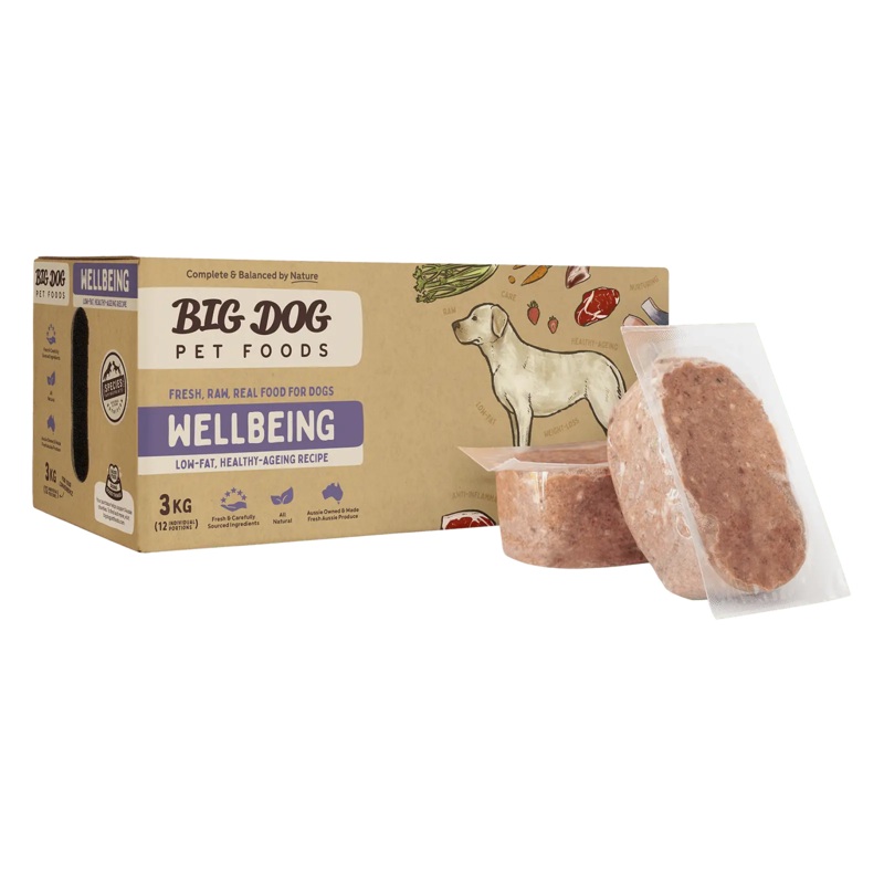 Wellbeing is a lower fat option raw diet, which has been specifically designed for overweight dogs or dogs battling with health conditions such as arthritis, pancreatic issues, liver conditions, renal failure and cancer. To their blend of lean muscle meat, vitamin and mineral-rich offal, crushed bone and cartilage, Big Dog add nutrient-dense fruits and vegetables and a blend of herbs and extras specific to the wellbeing diet recipe.