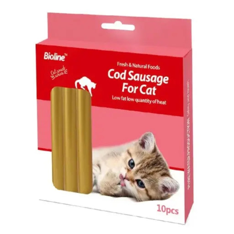 reat your cat to the delicious and nutritious Bioline Cod Sausage! Crafted with high-quality ingredients and produced using advanced filtration technology, these sausages offer a pure taste that enhances palatability and meets your cats nutritional needs. Rich in essential nutrients, they are perfect as daily food supplements or rewarding snacks.