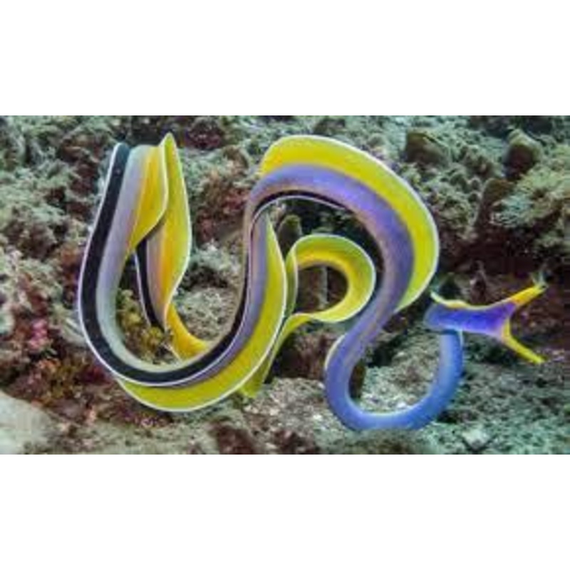 The Blue Ribbon Eel brings both beauty and personality to a saltwater display. It appreciates mature rockwork for hiding and foraging and thrives in stable conditions. Its diet is carnivore (chunks of seafood, krill, silversides), so offer a variety of qua