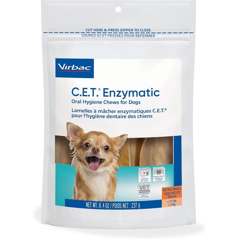 C.E.T. Enzymatic Oral Hygiene Chews for Dogs feature an exclusive Dual-Enzyme System, plus an abrasive texture. Working with the dog's chewing action, C.E.T. Enzymatic Oral Hygiene Chews reduce plaque and tartar helping keep teeth clean and breath fresh, e