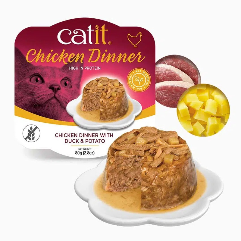 Catit Dinner is a healthy double-layered wet food made of the finest natural ingredients. This high-protein wet cat food is bursting with nutrients and contains added vitamins and minerals that benefit your cats health while also adding some moisture to your cats dry food diet. Our Catit Dinner recipes come in 12 highly palatable flavors, with two combined and delicioustextures.
