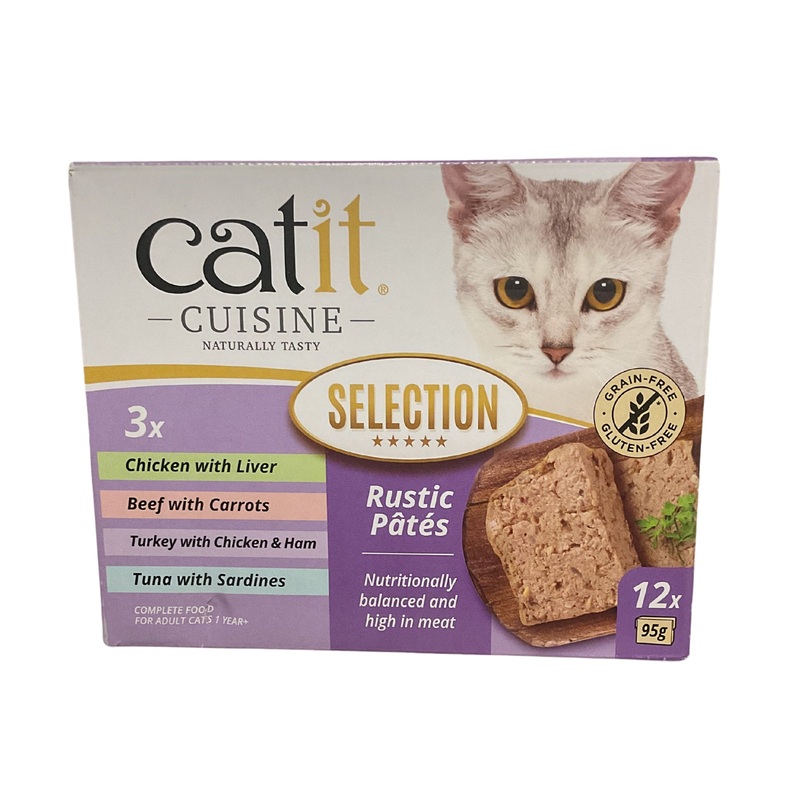 Catit Cuisine Wet Cat Food - Rustic Pates Multipack is packed with a variety of flavours. Chicken & Liver, Beef with carrots, Turkey with Chicken & Ham, Tuna with Sardines. These nourishing Rustic Pates are nutritionally balanced, high in meat content, and