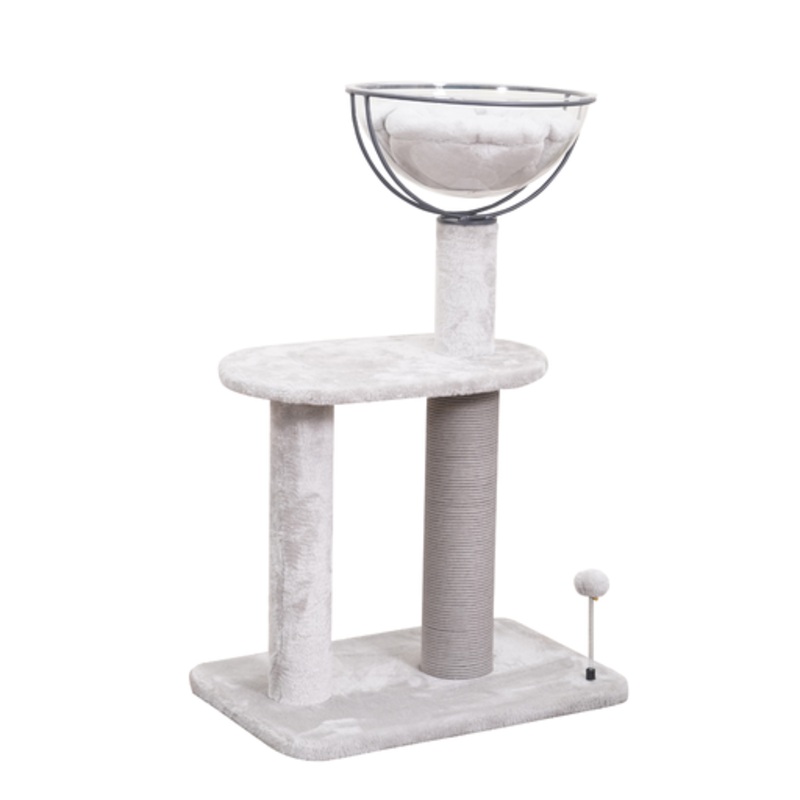 Cat scratching tree,simply partical board with paper rope designs fit for the family requirment, soft plush makes the pet soft, toppest arcylic ball makes it have a good rest, middle plate with enough space, bottom plate with toys let cat can play when hav