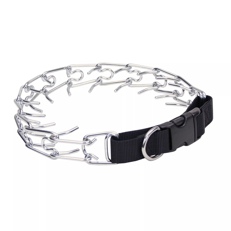 Introducing the Titan Easy-On Dog Prong Training Collar with Buckle, a training tool that combines strength and convenience to help you and your furry friend achieve your training goals. Crafted from electric welded, chrome-plated steel, this collar is engineered for maximum strength and durability. It’s built to last, ensuring that it won’t tarnish, break, or rust over time. The added convenience of a buckle makes it easy to put on and take off, simplifying the training process for both you and your dog. When used correctly, this prong training collar is a safe and effective tool to aid in training your pet. However, please note that it is not suitable for use as a tie-out collar, as safety should always be the top priority. The Titan Easy-On Dog Prong Training Collar with Buckle is designed to be the ideal training collar for your furry companion. Invest in this reliable and durable tool, and pave the way for effective training sessions that strengthen the bond between you and your pet.ApplicationsSafe, effective dog training tools with proper use.