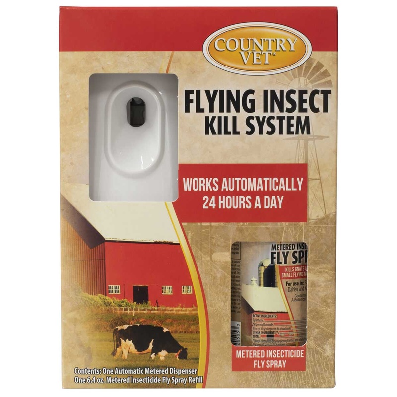 The Country Vet Automatic Flying Insect Kill System for Farms, Dairies and Kennels provides immediate relief from flying insects within an enclosed area. Country Vet dispenser automatically discharges Metered Insecticide Fly Spray once every 15 minutes. Se