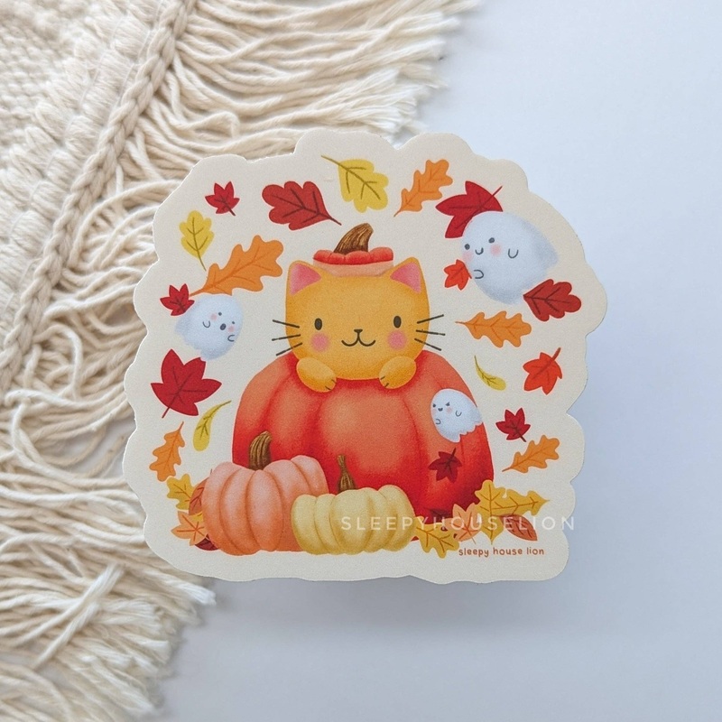 Cozy Kitty Autumn Pumpkins and Ghosts Orange Cat Vinyl Sticker