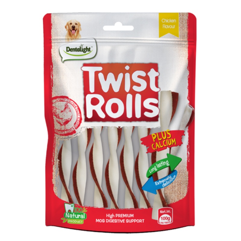 Dentalight 5" Twist Rolls Small Dog Treats 100g - Chicken FlavourTreat your furry friend to our flavorsome Chicken filet rolls enfolded in premium rawhide.With Prebiotics (MOS), and Calcium Carbonate, this healthy snack is prepared to promote a healthy dig