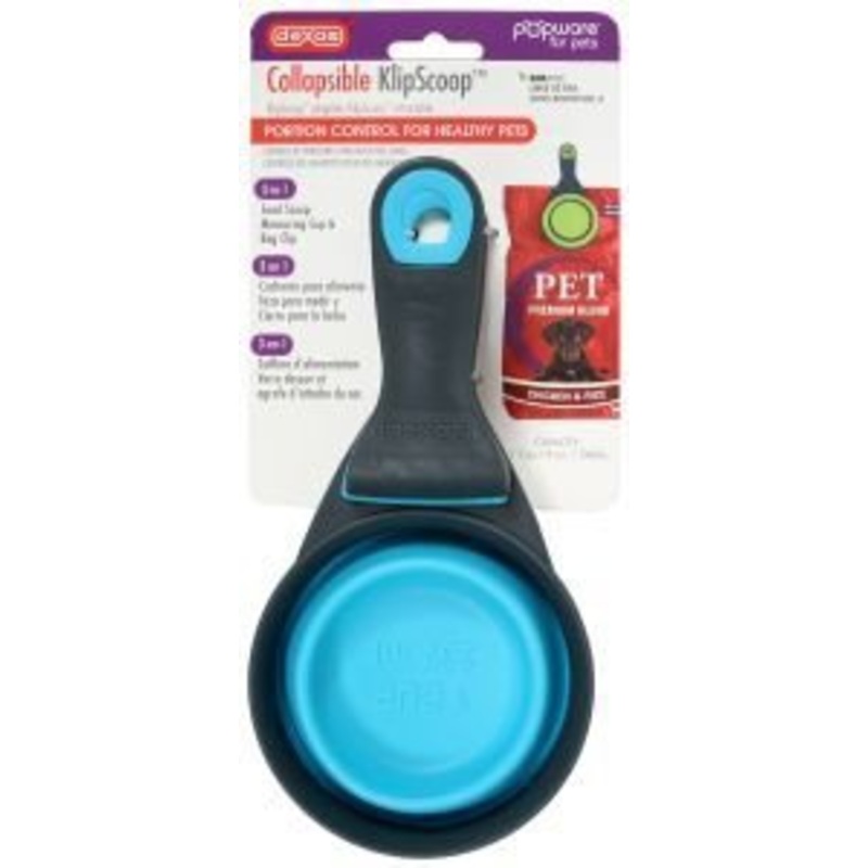 A 3-in-1 pet food tool: a dry food scoop, a collapsible measuring cup and a sturdy bag clip.