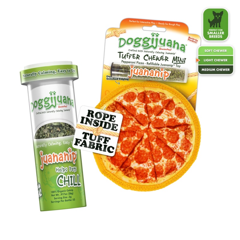 Designed for smaller breeds with big chewing energy, this durable toy features tuff fabric, rope core, and double-stitched edges to handle even the most enthusiastic chewers.Sprinkle a pinch of Juananip into the pouch to keep your pup calm and entertained