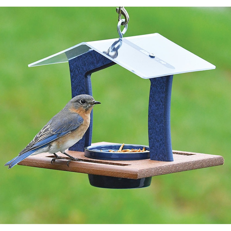 Provide shelter for your birds and fill the dish with mealworms, nuggets, suet pellets or seed. We love this multipurpose feeder for compact spaces, perfect for hanging from your arbor, pergola or porch. Made from clearview plastic, the anchored roof protects the food from wet weather with easy viewing of your birds. Includes eye hook for hanging with two wide, built-in perches on the bottom. 7 oz. blue porcelain ramekin, protect from freezing. Durable blue and brown recycled plastic. 8 x 7 x 7-1/2 inches tall overall.