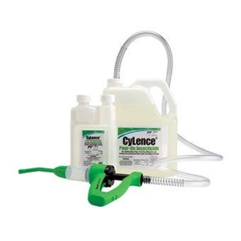CyLence Pour-On Insecticide:Six pints is a ready-to-use solution. An applicator gun can be used with this product size and may be sold separately. Dial the proper dosage on the application gun. Apply the required amount of solution directly along the top of the back and top of the head of the animal.