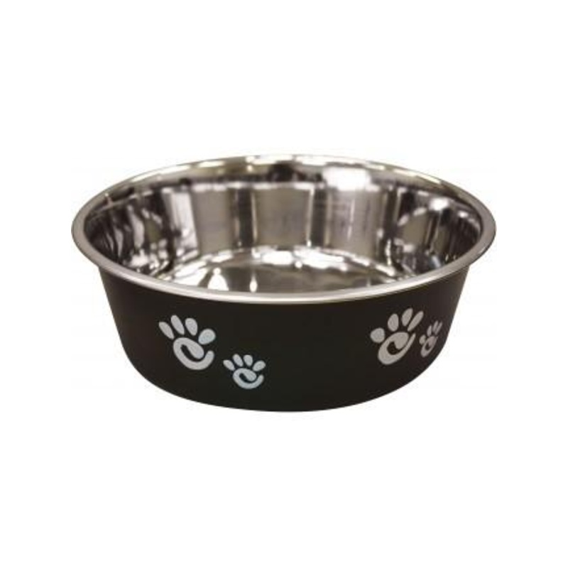64 oz size bowl that combines stainless steel and a decorative paw print matte finish exterior. Removable rubber ring for no slip and easy cleaning in the dishwasher.