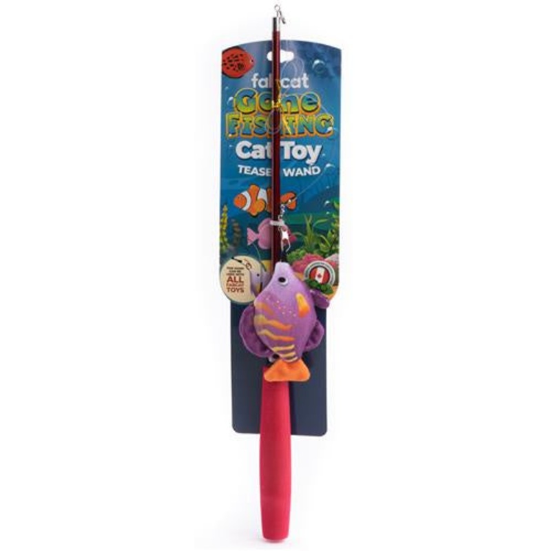 Cats will enjoy these new Fabcat toys. The Fabcat Gone Fishing teaser comes with a Fishing Pole with the Purple Tropical Fish cat toy. You can interchange toys on all Fabcat teasers with any Fabcat cat toy - all have loops.