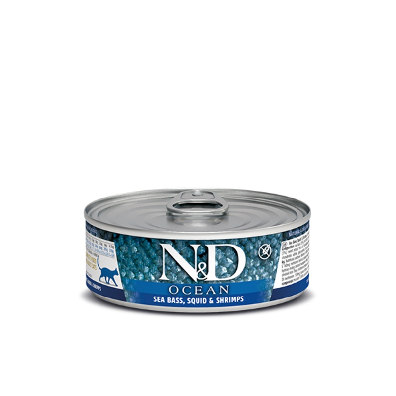 N&D Ocean Cat Trout, Salmon & Shrimp Recipe is formulated to meet the nutritional levels established by the AAFCO Cat Food Nutrient Profiles for maintenance. 100% Satisfaction Guaranteed.INGREDIENTSTrout, salmon, cod, herring, shrimp, sweet potatoes, herri