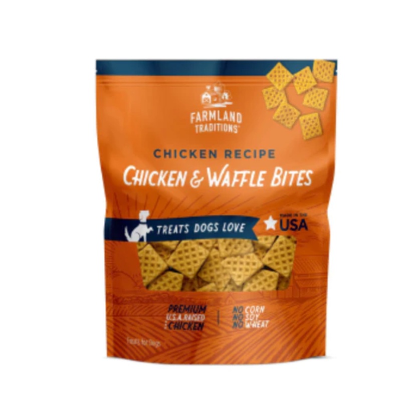Farmland Traditions waffle bites are made in our own US facility with USA raised chicken. These bite sized waffle treats are made with no corn, soy, or wheat and are simply air dried to create the savory taste that dogs love!INGREDIENTSChicken, Rice, Veget