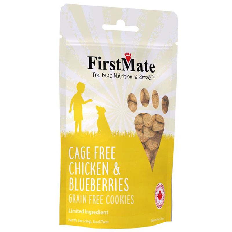 FirstMate's Limited Ingredient Chicken & Blueberries Treats are designed to be a meat-based alternative to a typical biscuit. We proudly use cage-free, humanely raised Chicken as our primary protein source. This grain, glycerine, gluten and pea-free formul
