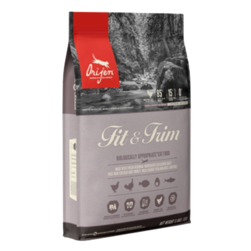 ORIJEN Fit & Trim provides your cat with protein and a unique blend of soluble fibre to support a healthy digestive environment. Two-thirds ofthe animal ingredients are FRESH or RAW, for a concentrated source of protein. With free-run chicken and turkey, w
