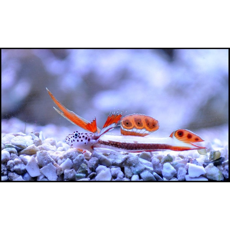 With distinctive markings, the Flaming Prawn Goby adds instant visual appeal. It appreciates mature rockwork for hiding and foraging and thrives in consistent conditions. Its diet is carnivore (small crustaceans, worms; will sift sand), so offer a varied b