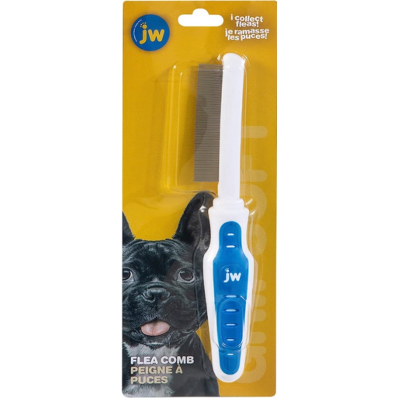 The Flea Comb is a comfortable ergonomically designed comb with metal teeth placed tightly together to pick up fleas in even the most dense coats. JW combs are specially designed with the teeth turned 90 degrees away from the skin to keep the teeth paralle