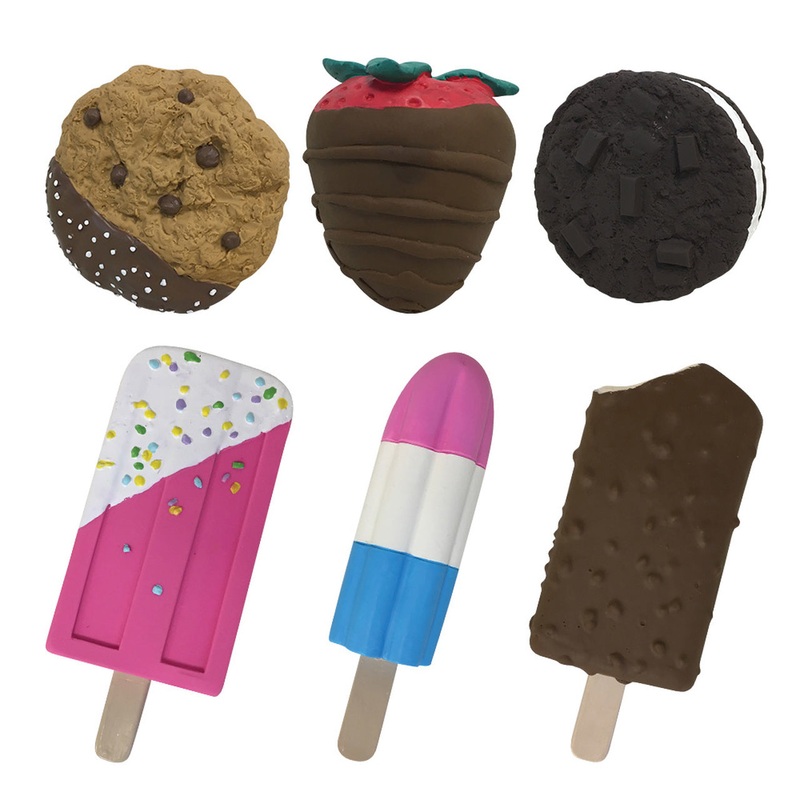 A temptingly sweet collection of latex chew toys in the shape of decadent desserts! Each texture of these yummy treats has been properly replicated. The realistic looking texture and stuffing makes for an irresistible chewing experience. There is also a bu