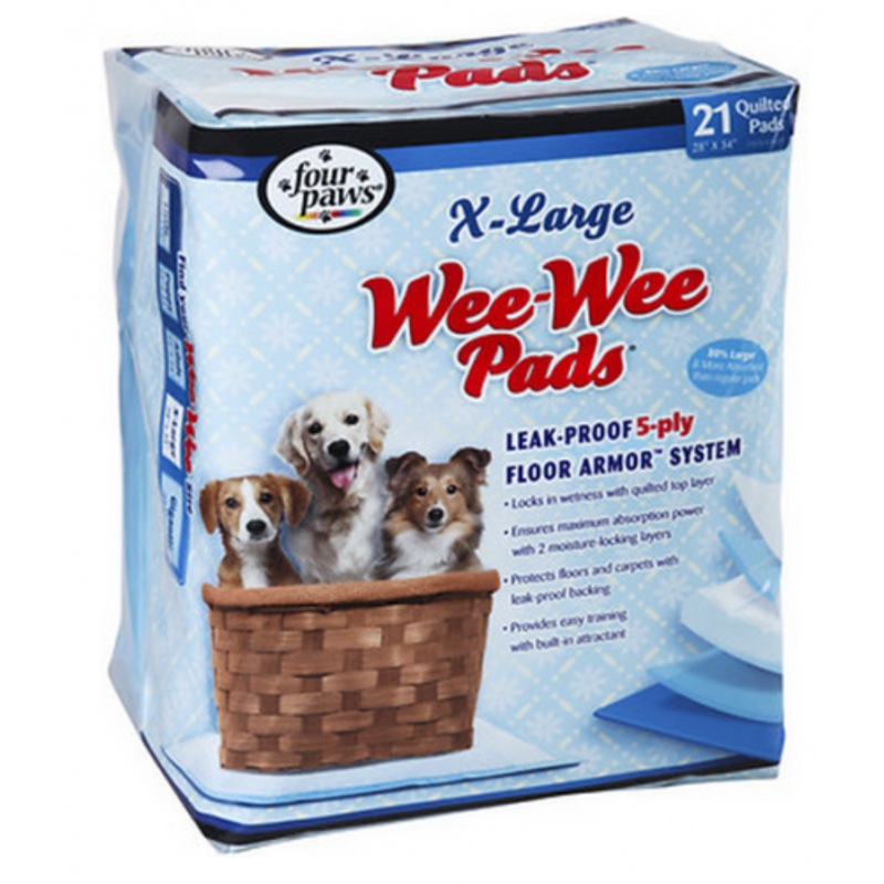 Being a puppy is tough! Lifes full of Put that down, I said off! and Not on the carpet!! With Four Paws Wee-Wee Extra Large Puppy Housebreaking Potty Pads, you can save your new pal (and yourself) a lot of unnecessary stress. Each pad is covered with a scented attractant that lets pups know theyve found the perfect place to use the bathroom and a leak-proof liner that makes housebreaking simple and clean.