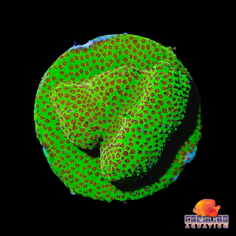This Stylocoeniella sp. has a yellow/green base color with tiny red polyps. Does best in moderate light intensity. On a 1-1/4 Frag Plug