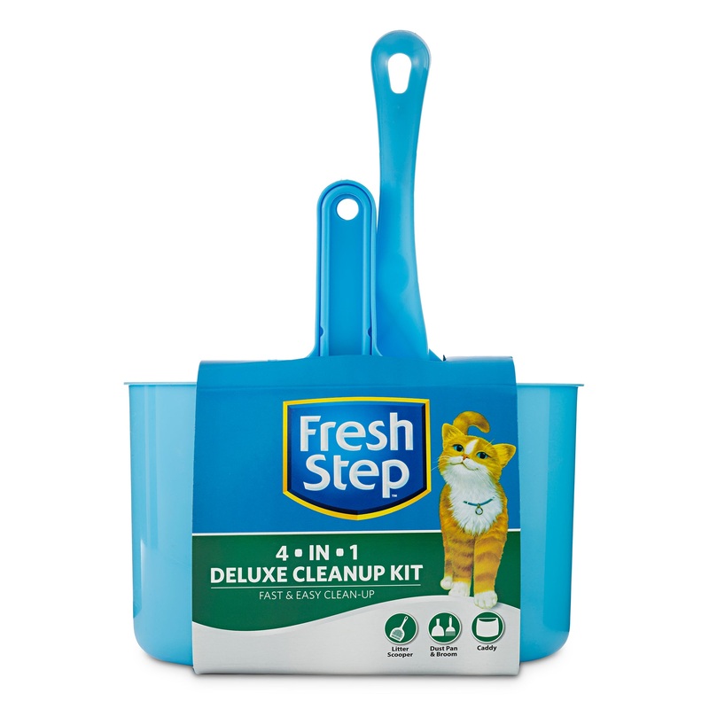 The Fresh Step 4 in 1 Deluxe Cleanup Kit will ensure your litter box remains clean, organized, and presentable. The super handy kit comes with a pooper scooper, dust pan, broom, and caddy. All of your cat supplies in one place! This kit makes cleaning your litter box easy and quick. When you need to collect cat feces, the litter scoop is at your disposal. And if excess litter falls on the floor, you have your broom right there to pick it up. The caddy conveniently hangs on the side of the litter box, so you don’t have to make a space for it! This is especially great if you need somewhere to store your cat litter scoop, which many litter boxes do not have a place for. These cat accessories will make your litter box look great and all come in a beautiful baby blue color. The kit is the perfect solution for those of us with too much cat stuff and nowhere to put it. The cat cleaning supplies will be attached to your litter box, ready when you need them. The kit is versatile and will work with disposable litter boxes, plastic cat pans, and litter box liners. And if you already have a cat scooper in your possession, it’s always great to have a spare! YOUR SATISFACTION IS OUR PRIORITY: If you have any questions or feedback on this product, please reach out to us at [email protected]