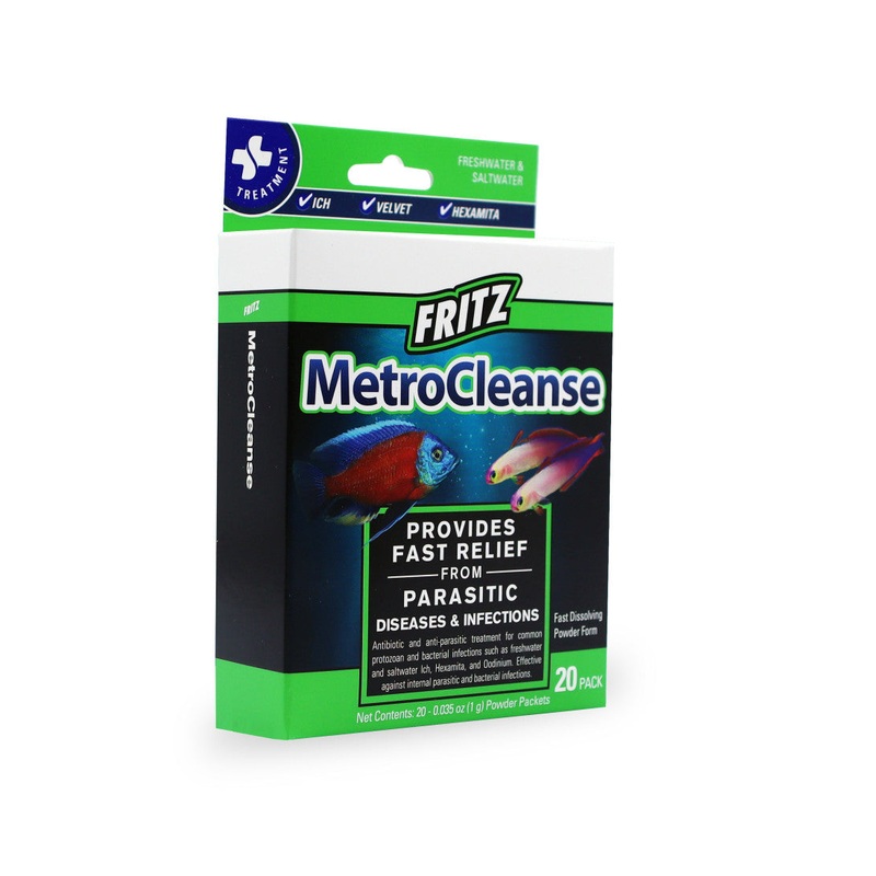 Fritz MetroCleanse is a safe and effective antibiotic and anti-parasitic treatment for several common protozoan and bacterial infections such as freshwater and saltwater Ich, Hexamita, and Oodinium, and is also effective against internal parasitic and bact
