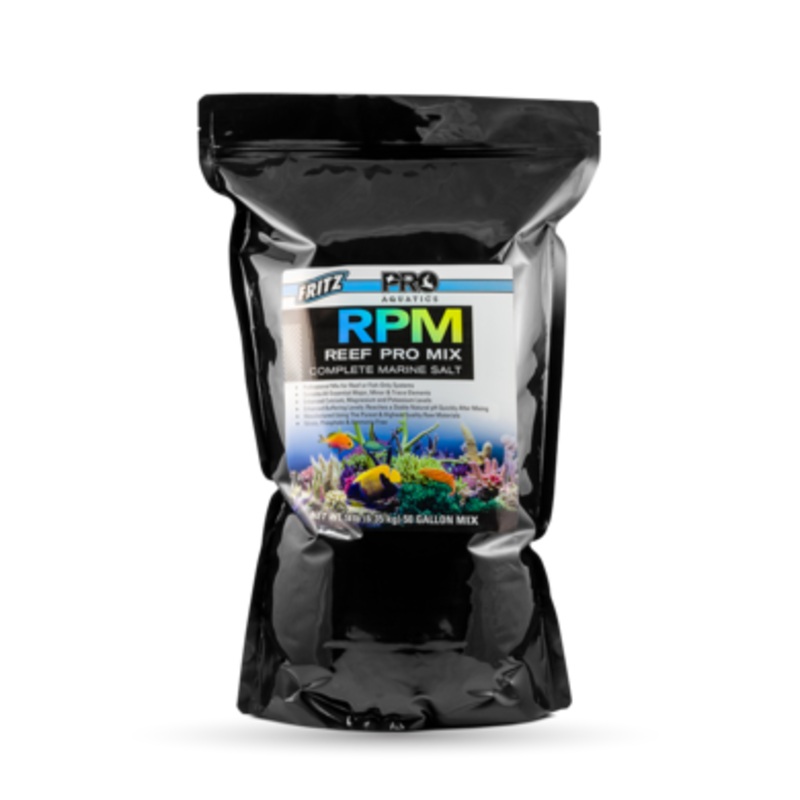 Fritz Aquatics’ Reef Pro Mix (RPM) is a professional-grade marine salt mix formulated for both reef and fish-only aquarium systems. It contains all essential major, minor, and trace elements found in natural seawater, promoting the health and longevity of marine life. The mix is designed to reach a stable pH shortly after mixing and is free from nitrates, phosphates, and ammonia.Key Features:Complete Marine Salt Mix: Suitable for reef and fish-only systems.Balanced Composition: Contains essential major, minor, and trace elements.Enhanced Buffers: Achieves stable pH levels promptly after mixing.Elevated Nutrients: Higher levels of calcium, magnesium, and potassium.Purity: Free from nitrates, phosphates, and ammonia.Mixing Instructions:Water Quality: Use RO/DI water with a TDS reading below 10 ppm.Preparation: Fill a clean mixing container with the desired amount of water.Temperature: Maintain water temperature between 70F and 75F (21C – 24C) during mixing.Adding Salt: Slowly add RPM to the water to prevent temperature rise and precipitation.Mixing: Use a mixing pump and an airstone to ensure uniformity and prevent precipitation.Salinity Adjustment: Use a calibrated refractometer to achieve the desired salinity (1.025 sg).Temperature Adjustment: Once mixed, heat the solution to match your aquarium’s temperature.Resting: Allow the mixed water to sit for at least two hours before use.Available Sizes:55 lb Box: Treats up to 200 gallons at 30 ppt salinity.48 lb Bucket: Treats up to 180 gallons at 30 ppt salinity.14 lb Bag: Treats up to 53 gallons at 30 ppt salinity.