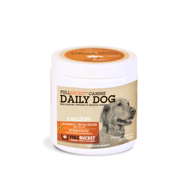 Our FullBucket Daily Dog is a breakthrough concentrated yeast-based formula that naturally supports digestion and immune function in adult dogs. With probiotic, prebiotic, digestive enzymes & L-Glutamine.