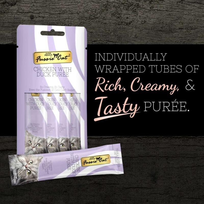 Fussie Cat Chicken with Duck Pure is love at first lick.Creamy in texture and rich in taste, this indulgent, flavorsome puree will make eventhe Fussiest of Cats demand more!Fussie Cat Chicken with Duck Pure is an easy-to-feed cat treat with essential vitam
