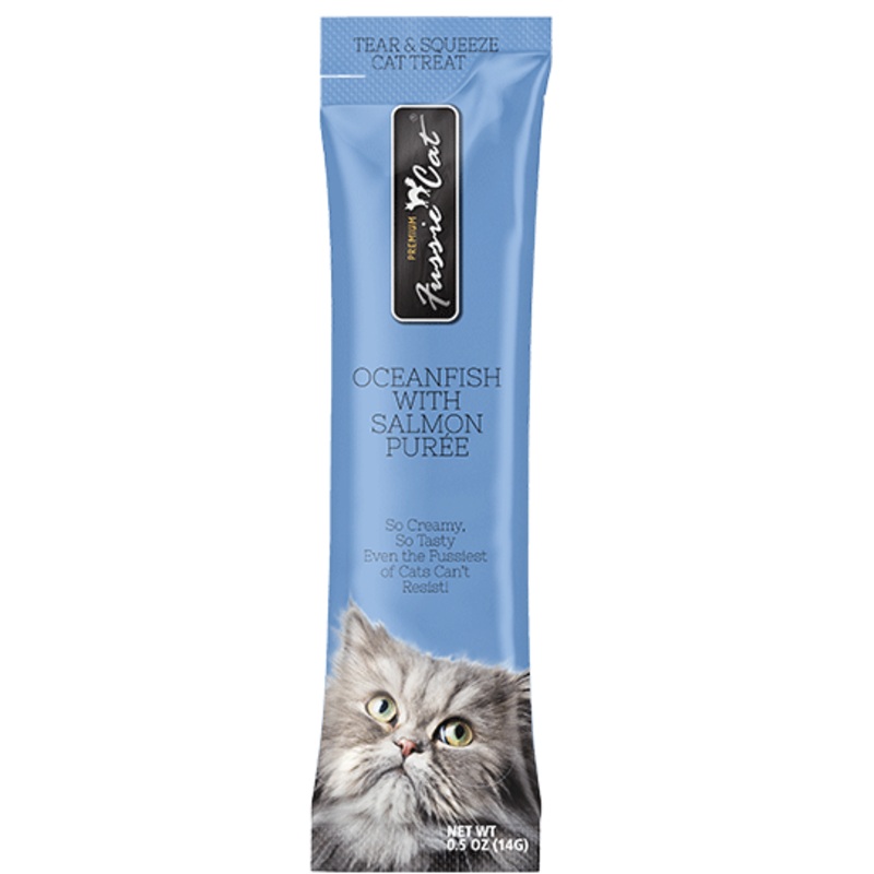 Fussie Cat Oceanfish with Salmon Pure is love at first lick.Creamy in texture and rich in taste, this indulgent, flavorsome puree will make eventhe Fussiest of Cats demand more!Fussie Cat Oceanfish is an easy-to-feed cat treat with essential vitamin E for your cats diet tosupport healthy skin and coat.