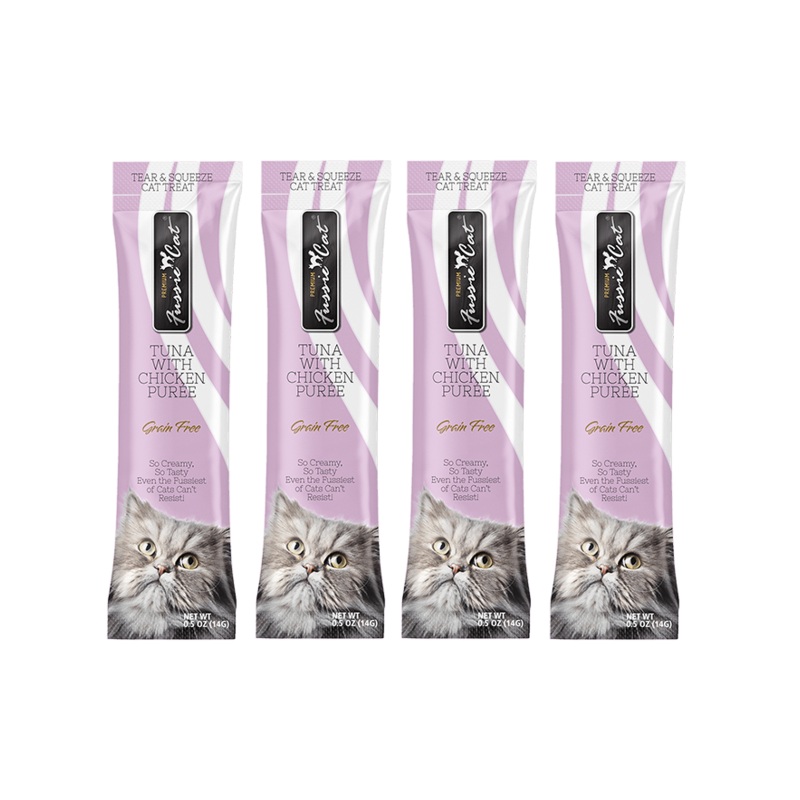Fussie Cat Tuna with Chicken Cat Treats (2-oz 4 Pack)Fussie Cat Tuna with Chicken Pure is love at first lick.Creamy in texture and rich in taste, this indulgent, flavorsome puree will make eventhe Fussiest of Cats demand for more!Fussie Cat Tuna with Chick