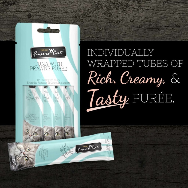 Fussie Cat Tuna with Prawns Pure is love at first lick.Creamy in texture and rich in taste, this indulgent, flavorsome puree will make eventhe Fussiest of Cats demand more!Fussie Cat Tuna with Prawns Pure is an easy-to-feed cat treat with essential vitamin