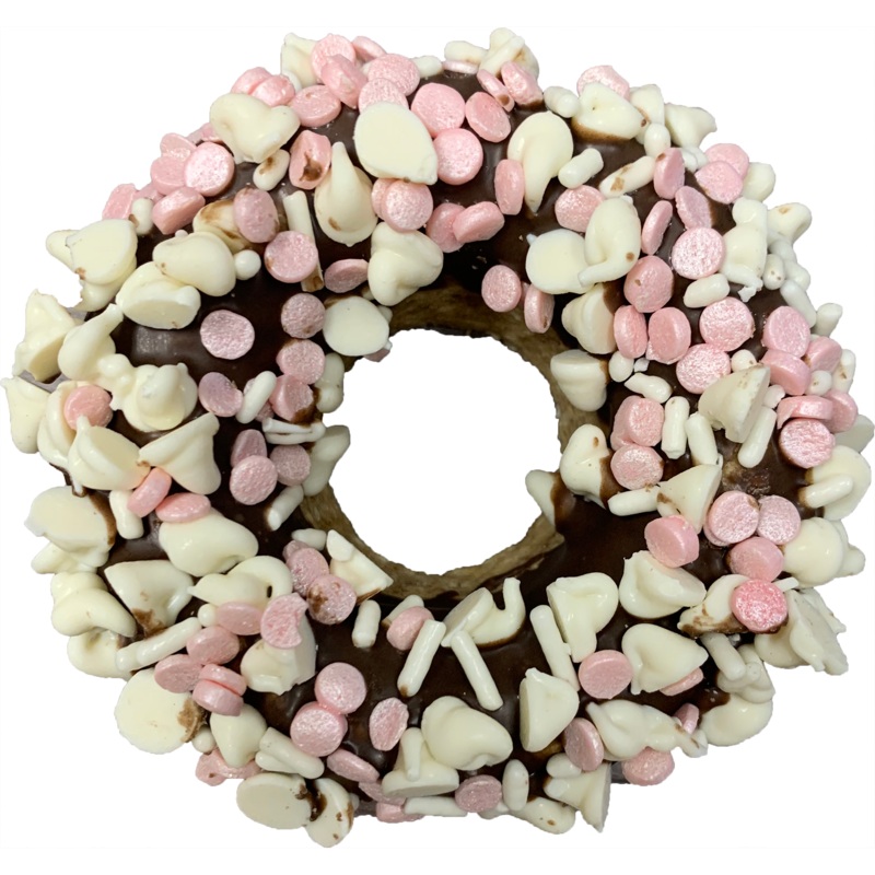 Our Gourmet Donuts are DOUBLE DIPPED and loaded with fun flavors your dog will surely love. Our Chocolate (carob) covered Strawberry is dipped in pink yogurt then dipped in carob, topped with scrumptious yogurt chips and drizzled with our famous house made