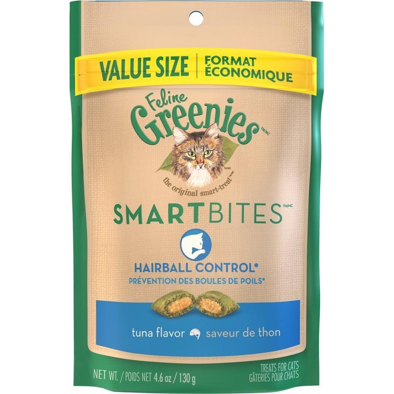 FELINE GREENIES SMARTBITES Hairball Control Cat Treats contain natural ingredients with our FIBERBLEND Formula to help minimize hairball formation and promote healthy digestion. Best of all, they are absolutely packed with delicious tuna flavor in two irresistable flavors. One treat a day is all it takes to cut down on cleaning up your furry friend’s hairballs.