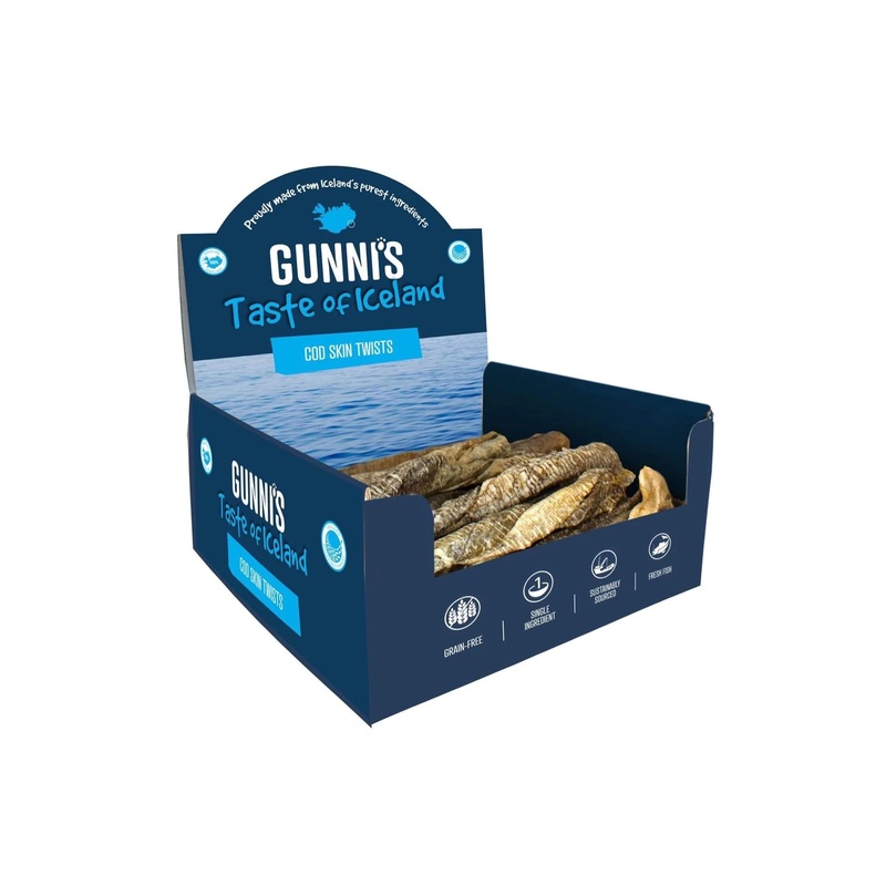 DescriptionChew MeterIngredientsGTD AnalysisGunni's Cod Skin Twist Dog Chews are tasty treats to satisfy your pups wild cravings, while promoting healthy teeth and gums. Caught in the pure fresh waters of Iceland and made from 100% cod skin strips, they're