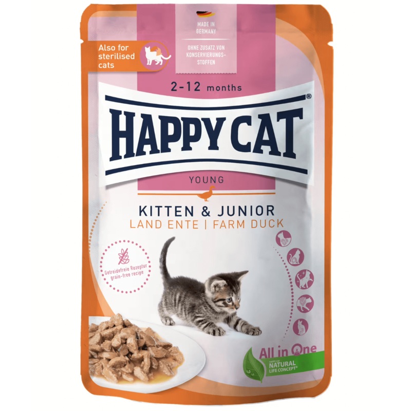 Happy Cat Meat in Sauce Kitten & Junior Land Duck wet cat food has been specially developed for kittens aged 2 to 12 months. This carefully prepared recipe features a high proportion of 90% animal protein, promoting harmonious growth and supporting your kitten’s body’s defenses.