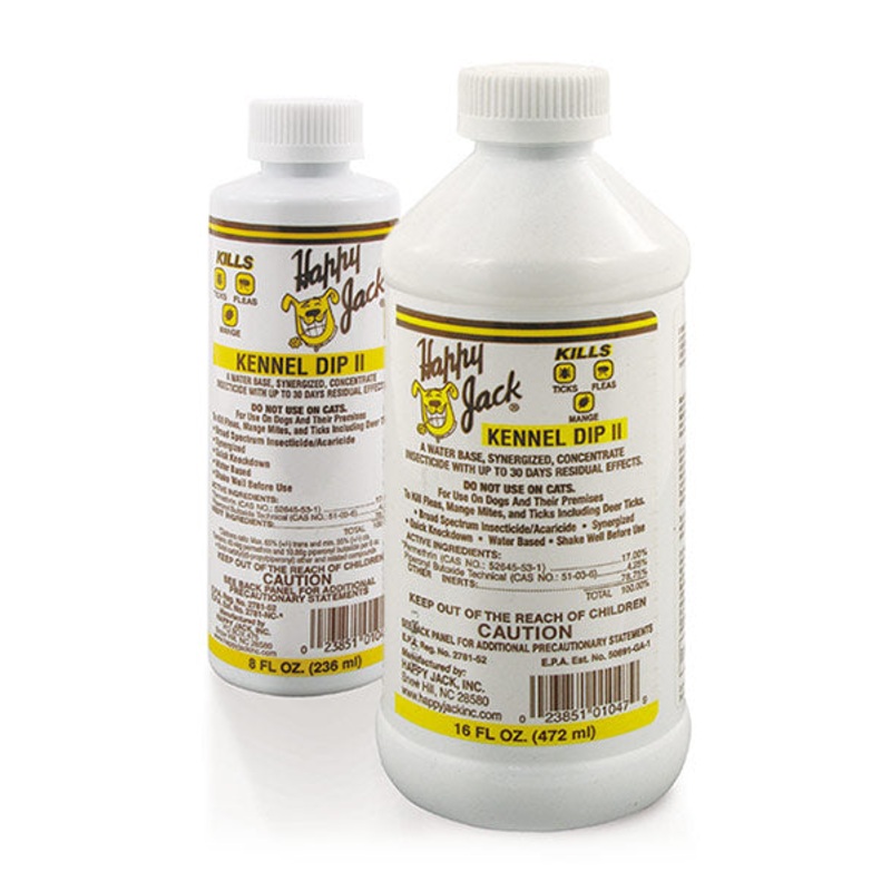 Kennel Dip II is a water-based, environmentally friendly concentrate that provides 30-day residual control of fleas, ticks (including deer ticks), lice, mange mites and stable flies. Effective and economical, it can be used as a dip, a sponge on or a premi