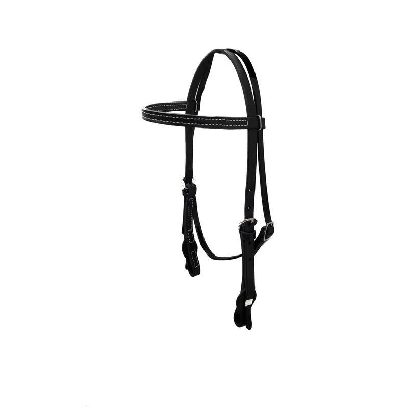 White stitch detailing on browband, black leather headstall with quick change metal loop and leather slide cheeks.