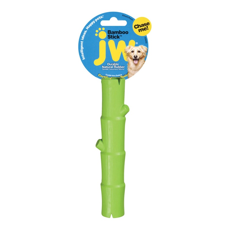 JW Bamboo Stick is a durable, rubber dog toy that's the perfect shape for throwing, fetching, and carrying. A solid center makes this stick capable of standing up to endless games and intense chewers. Bamboo Stick has open ends that can be stuffed with tre