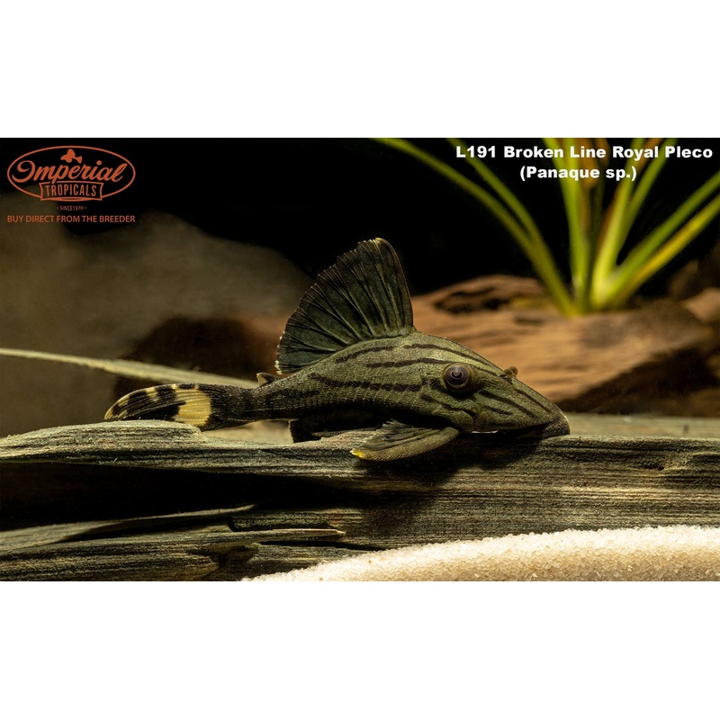 Remarks: The L191 Broken Line Royal Pleco, also called Dull-Eye Royal Plecos, are suited for tanks 125 gallons or more due to their maximum size and preference for hiding under large pieces of wood. Like other Panaque species, they get their nutrition from