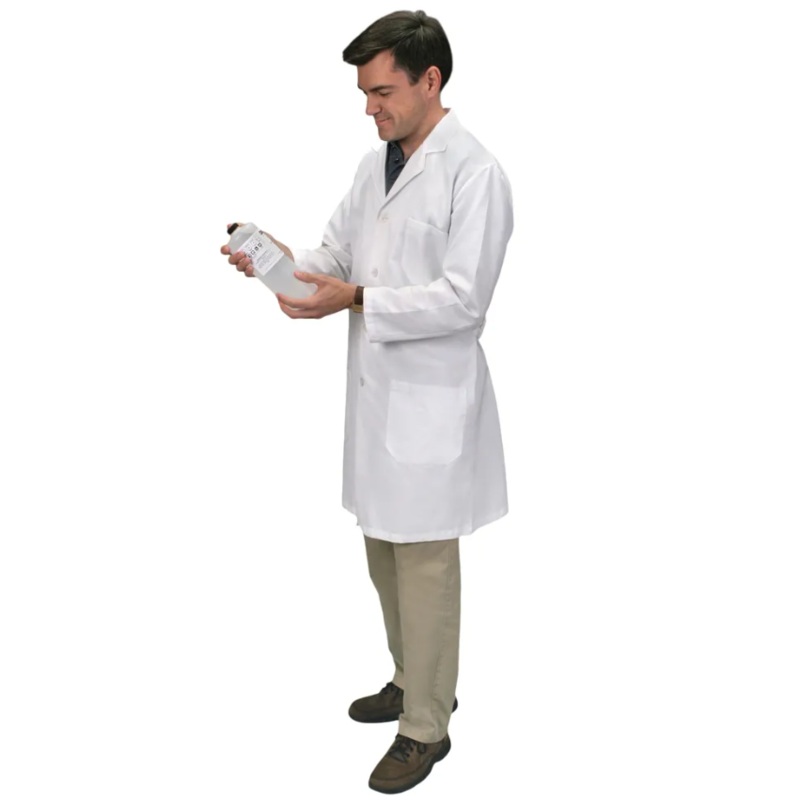 This economical and stylish knee-length lab coat is made of 35% cotton, 65% polyester easy-care twill fabric. Features include left breast pocket, roomy side pockets, side slit openings, and adjustable back belt. Men's tailoring; size determined by chest m