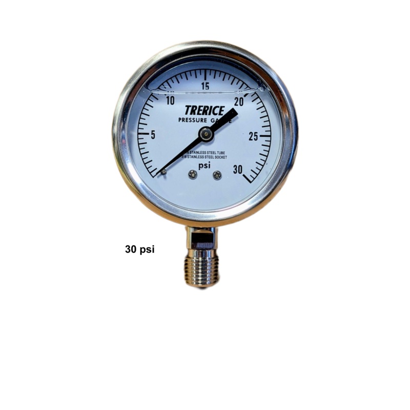 For pressure measuring of liquid or gas; also where vibration is a concern.2-1/2" dial size, 1/4"NPT lower mountStainless steel case, glycerin filledPressure range: 0-30 psi or 0-60psi