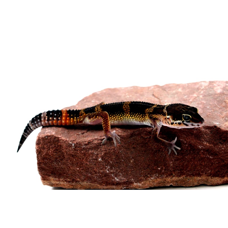 Medium Grade Black Night Leopard Gecko - Black Night leos always darken more as they age. This particular one will continue to darken with the pattern fading out over time. We are not sure but this particular gecko might retain the unique orange spot on th