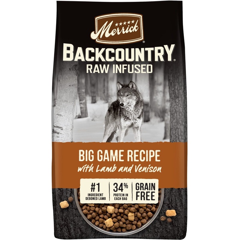 Connect your dog to an ancestral diet with Merrick Backcountry Raw Infused Grain Free Dog Food! This freeze-dried meal combines raw-coated kibble with raw dog food bites for all the benefits of a high-protein, raw diet in an easy-to-serve dry food. The highly digestible Big Game Recipe features real lamb as the first ingredient. Each bite is rounded out with wild boar and venison plus added vitamins, minerals and taurine. High levels of omega fatty acids help maintain your pups skin and coat, while glucosamine and chondroitin support healthy hips and joints. Return your dog to the diet that nature intended with Merrick Backcountry. Proudly crafted and cooked in the USA.