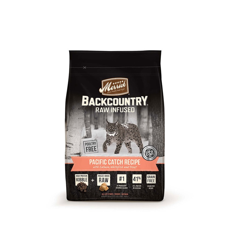 Backcountry Raw Infused recipes for cats deliver a perfect combination of protein-rich, grain-free kibble plus real whole pieces of raw, freeze-dried meat for the nutritional benefits and fresh taste of a raw diet in a convenient format for pet parents. High-protein kibble starts with real deboned meat, poultry or fish as the first ingredient. Grain-free with no gluten ingredients. This recipe is also rich in omega fatty acids for a healthy skin & coat. Freeze-dried raw protein pieces are mixed into the kibble in a pure state to provide a nutritional boost, easy digestion and the fresh taste cats love. The raw inclusion goes through rigorous testing and a proven process called High-Pressure Processing (HPP) to ensure food safety. Merrick Backcountry Raw Infused Pacific Catch Recipe Cat Food is formulated to meet the nutritional levels established by the AAFCO Cat Food Nutrient Profiles for All Life Stages.